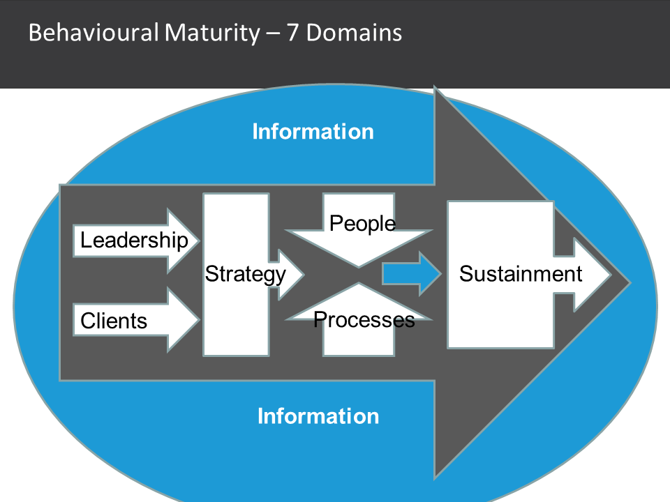 Our Behavioural Maturity diagnostic depicts four (4) maturity levels of behaviour and practice across seven (7) organisation levers shown here.