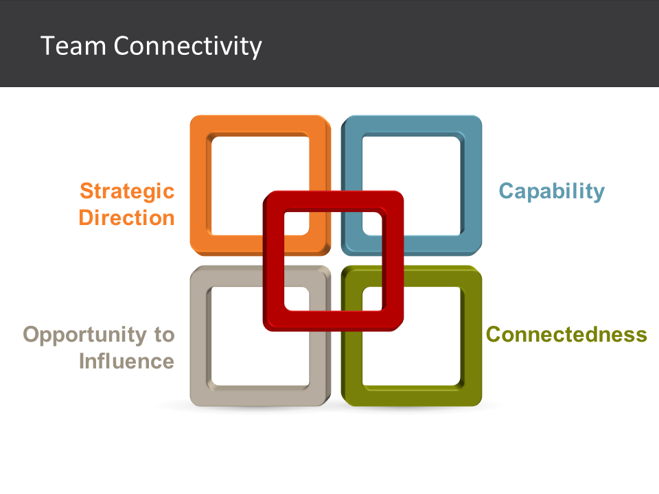 Specifically, a Team Connectivity assessment is a strategic scan of four (4) key drivers of engagement and discretionary effort; being a Team’s Strategic Direction, Capability, Opportunity to Influence and Connectedness as shown here.