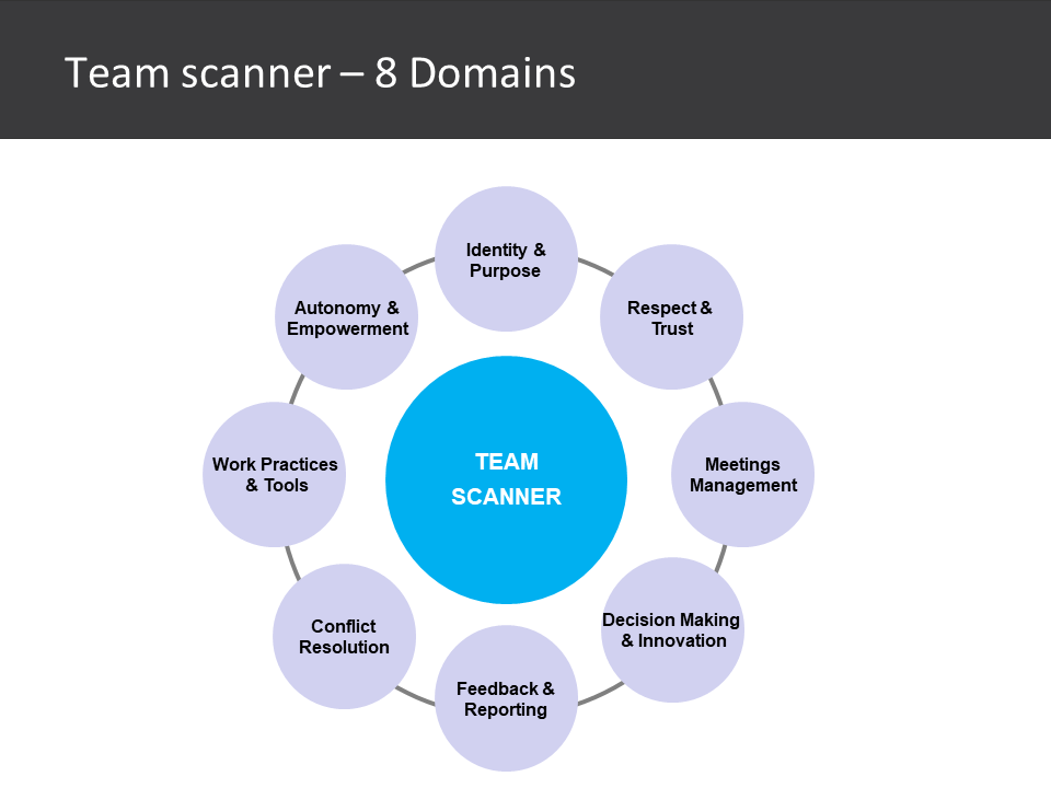 With the Scanner, we are able to inform that choice by directing team members and leaders to some 50 indicative routines spanning 8 dimensions or behavioural domains of a team’s operations.